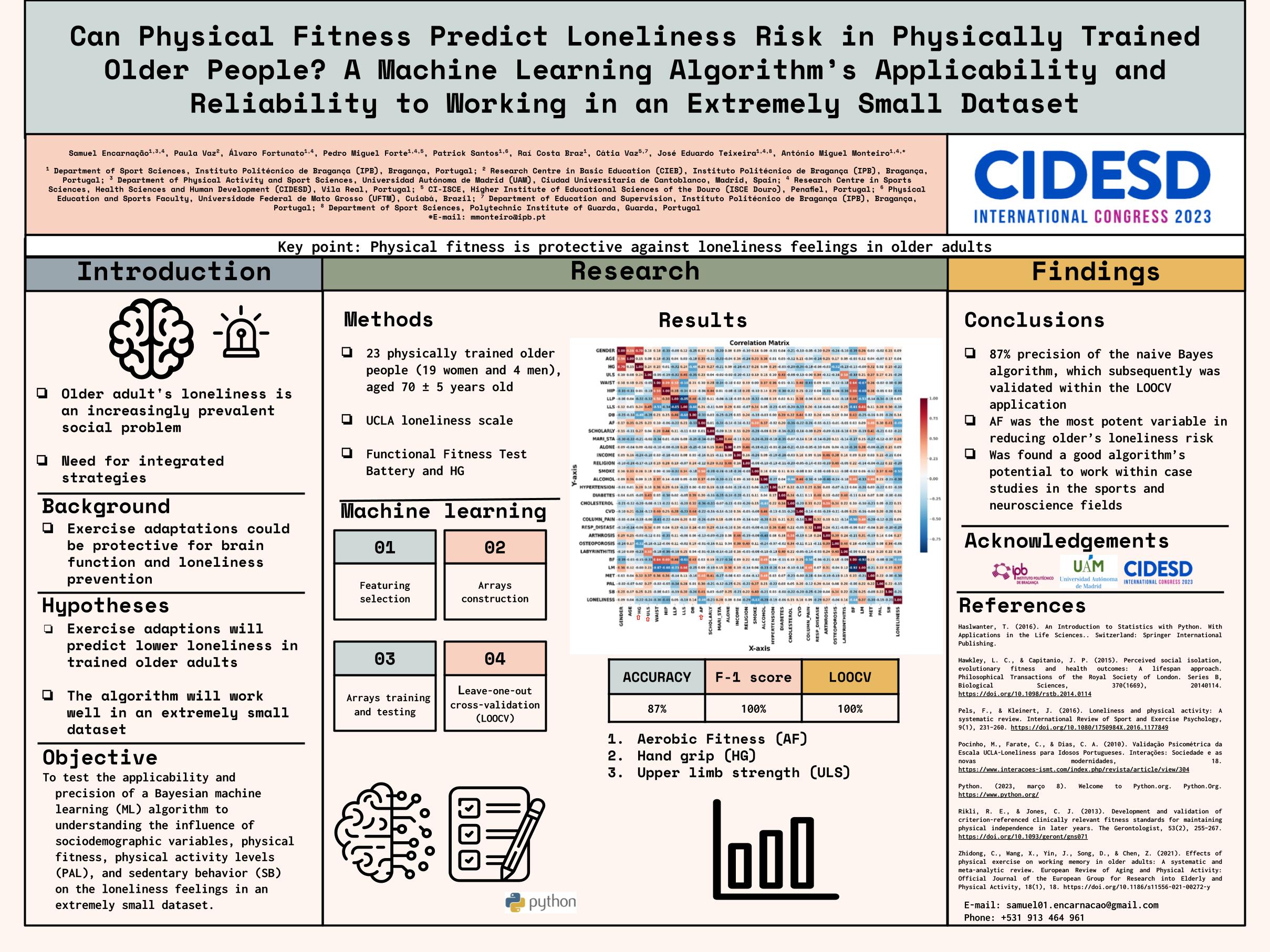Encarnação, Samuel Gonçalve; Vaz, P. M.; Fortunato, A.; Forte, P. M.; Santos, P.; Braz, R.C.; Vaz, C.; Teixeira, J.E.; Monteiro, A.M. (2023). Can physical fitness predict loneliness risk in physically trained older people? A machine learning algorithm's applicability and reliability to working in an extremely small dataset. [Comunicação em Poster]. CIDESD International Congress 2023. Vila Real: Universidade de Trás-os-Montes e Alto Douro